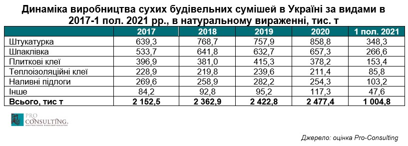 Аналітиками Pro-Consulting було проведене дослідження ринку сухих будівельних сумішей в 2017 – 6 міс. 2021 р. В звіті описані такі продукти, як штукатурки, шпаклівки, сухі клеї, системи теплоізоляції, наливні підлоги та інші.