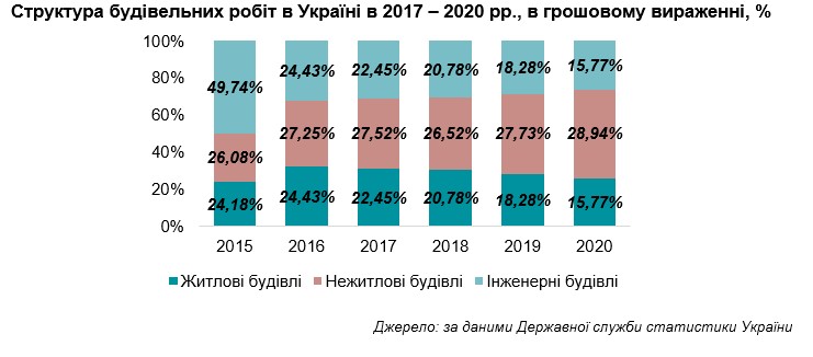 У структурі будівельних робіт переважають інженерні споруди. Такі проекти зазвичай мають дуже великі масштаби, потребують складних рішень, існують в єдиному екземплярі та не схожі на інші споруди. Це все значно піднімає ціну таких проектів. Частка інфраструктурних проектів з роками збільшується, що підвищує попит на продукцію з особливими характеристиками.