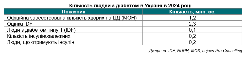 Споживання. Офіційні та експертні оцінки різняться: за заявою МОЗ (2024 р.) діагноз «цукровий діабет» у країні встановлено для близько 1,2 млн осіб, тоді як профільні організації оцінюють реальну кількість хворих у понад 2,7 млн; частина випадків діабету II типу лишається недіагностованою через безсимптомний початок захворювання.
