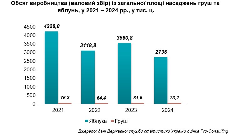 5. Обсяг виробництва (валовий збір) із загальної площі насаджень груш та яблунь в Україні, у 2021 – 2024 рр., тис. ц