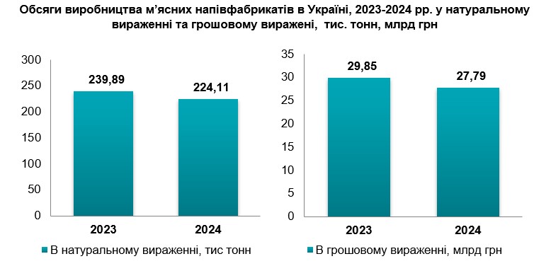 4. Обсяги виробництва м’ясних напівфабрикатів в Україні, 2023-2024 рр. у натуральному вираженні та грошовому виражені, тис. тонн, млрд грн
