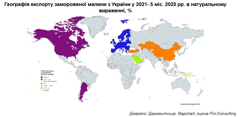 Заморожена українська малина є одним із найбільш експортованих холодних рослинних напівфабрикатів з представленістю у 39 країнах. Вона становить частку 46,3% від усього обсягу експорту заморожених ягід за період 2021-5 міс. 2025 рр.