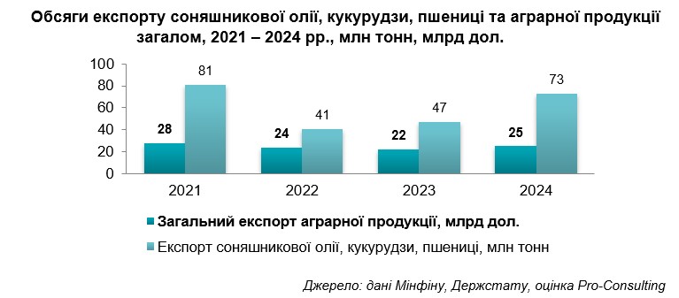 У 2024 році Україна майже вийшла на довоєнний період експорту – 24,5 млрд дол. США, який склав 59% в загальному експорті. Імпорт сільськогосподарської продукції у 2024 році в Україну становив 7,8 мільярда доларів.