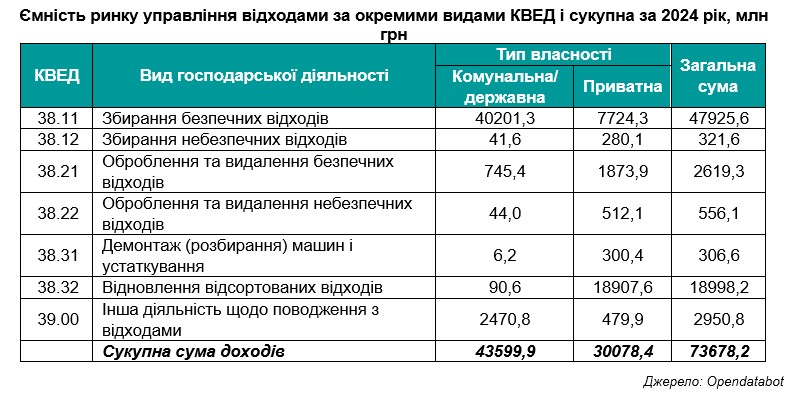 Повномасштабне вторгнення станом на 2024 рік завдало сектору управління відходами шкоди на $6,8 млрд, потреби в розмінуванні територій, які зазнали впливу війни, оцінюються в $29,8 млрд. Загальна ємність сектору поводження з відходами в Україні у 2024 році приблизно дорівнює $1,8 млрд. При цьому частка доходів приватних компаній, за даними Opendatabot, становить $749 млн. Комунальні підприємства мають частку 59,2% всього сектора ($1,1 млрд у 2024 році).