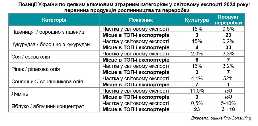 14. Позиції України по деяким ключовим аграрним категоріям у світовому експорті 2024 року: первинна продукція рослинництва та переробки