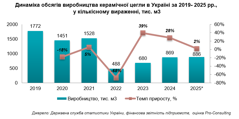 Український ринок керамічної цегли у досліджуваний період зазнав суттєвих коливань, зумовлених макроекономічними та соціальними факторами. Після зниження обсягів виробництва у 2020 році, спричиненого пандемією COVID-19, у 2021 році ринок частково відновився завдяки активізації житлового будівництва. Водночас у 2022 році через повномасштабну війну спостерігалося різке скорочення виробництва та споживання будівельних матеріалів, у тому числі керамічної цегли. Частина виробничих підприємств зупинила діяльність або перемістила потужності у більш безпечні регіони.