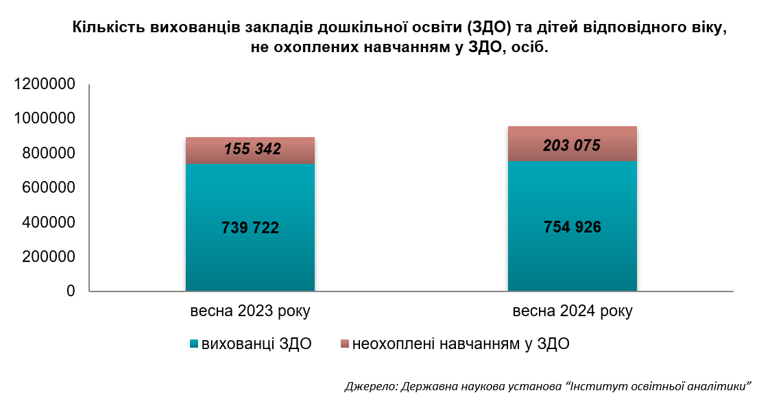 У дитячих садках за 2022 рік кількість вихованців зменшилася на 33% (з 1 111 358 до 739 722), а в 2023 році незначно збільшилася (+2%, до 754 926). Частка дітей дошкільного віку, які не відвідують садки, зросла з 21% до 27%.