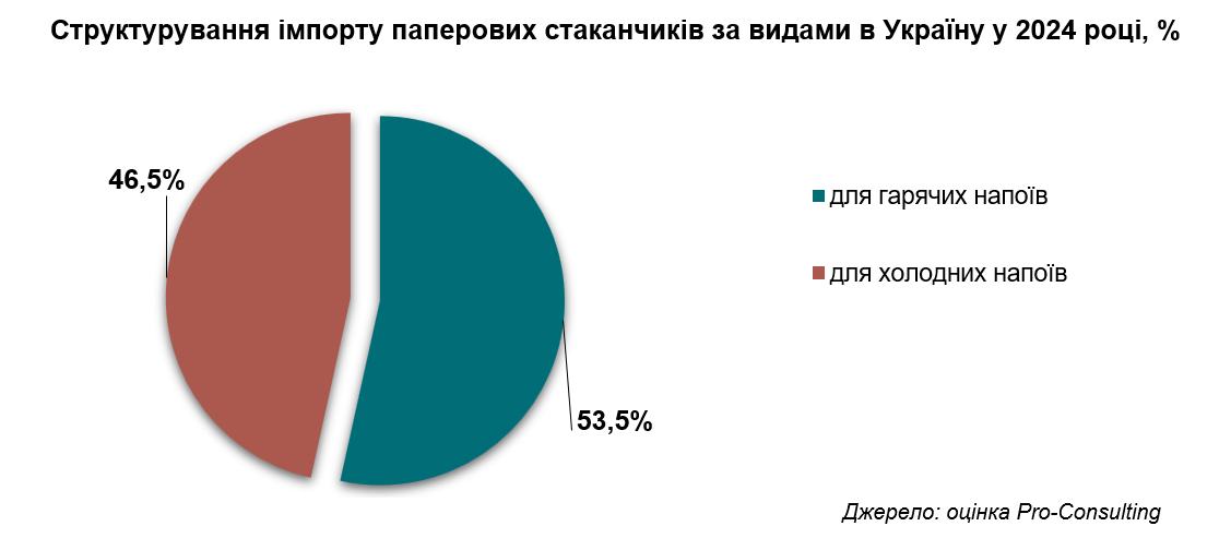 У 2024 році загальний обсяг імпорту товарів на ринок паперових стаканчиків в Україні розподілявся на дві майже рівні частини: