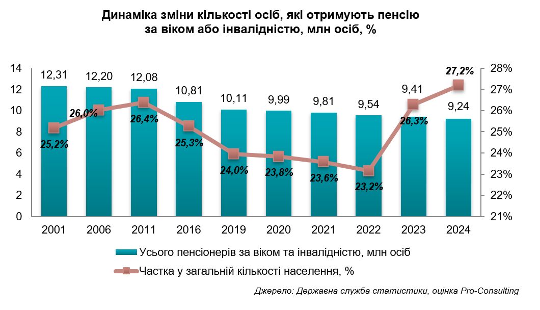 З 2001 по 2024 рік кількість пенсіонерів за віком та інвалідністю скоротилася з понад 12 млн до 9,2 млн осіб. При цьому їх частка в населенні зросла з 25% до майже 27%. Це свідчить про старіння суспільства та необхідність розвитку ринку геріатричних послуг в Україні.
