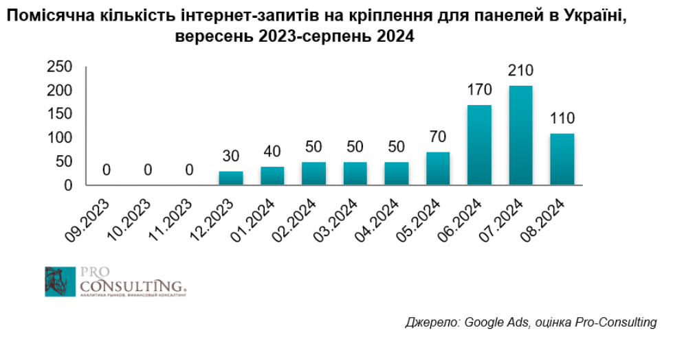 За даними Google Ads, у період з вересня 2023 року по серпень 2024 року спостерігалося зростання інтернет-запитів на тему кріплень для панелей. Якщо на початку періоду інтерес був мінімальним, то до літа 2024 року кількість запитів зросла в кілька разів, досягнувши піку в липні. Це відображає як сезонний фактор, так і загальне збільшення інтересу до сонячної енергетики.