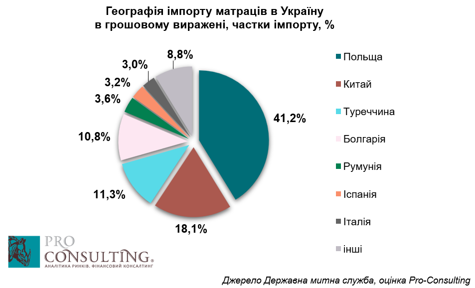 Основними постачальниками імпортної продукції на ринку матраців в Україні залишаються Польща та Китай. За підсумками 2023 року саме ці країни забезпечили майже 60% від загального обсягу імпорту.
