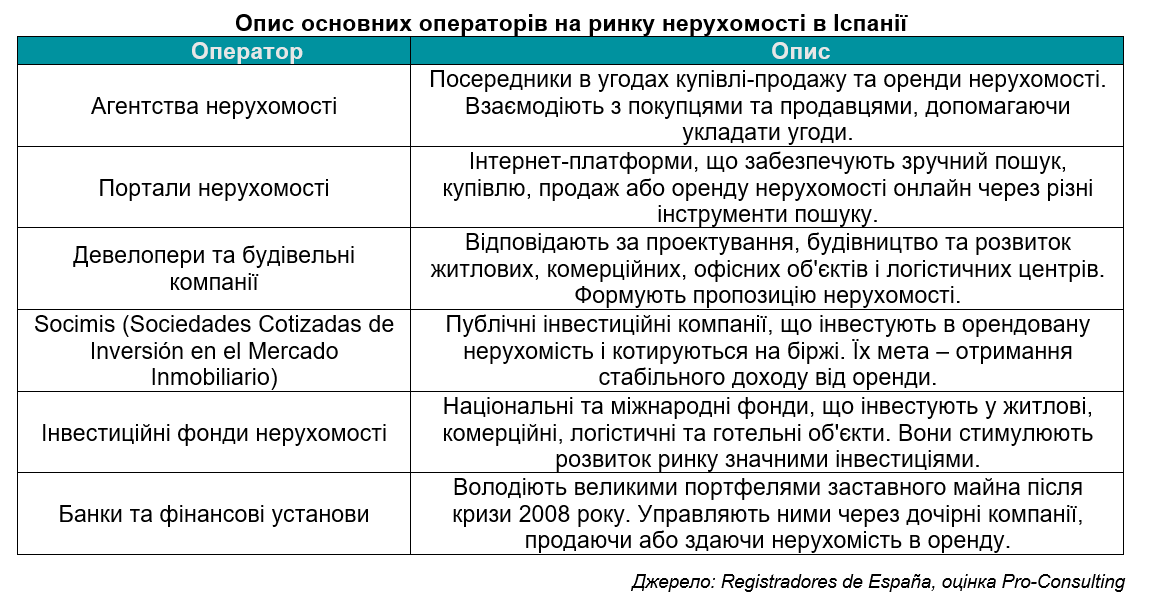 Ключовими гравцями виступають агентства нерухомості, девелопери, будівельні компанії, інвестиційні фонди, публічні компанії Socimis, а також банки, які управляють заставними активами.