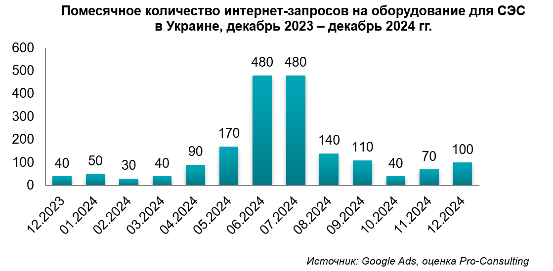 Споживчий аналіз ринку обладнання для СЕС в Україні показав, що пошукова активність в інтернеті досягла піку в червні-липні 2024 року – період масових відключень електроенергії. Основне зростання попиту спостерігається в приватному секторі, тоді як промисловий сегмент стримується ризиками обстрілів і втрати сонячно активних територій на півдні та сході країни.