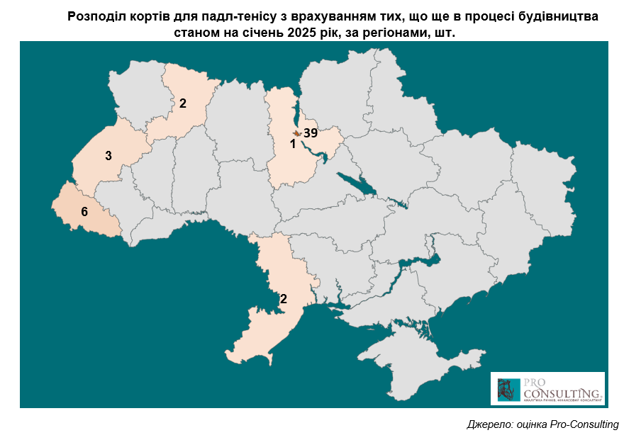 Основним центром розвитку ринку падл-тенісу в Україні став Київ, де розташовані 39 кортів. Крім столиці, активність спостерігається в Ужгороді (6 кортів), Львові (3), Одесі (2) та Рівненській області (2). Таким чином, географія поступово розширюється, хоча поки що ринок падл-тенісу в Україні залишається сконцентрованим у декількох ключових точках.