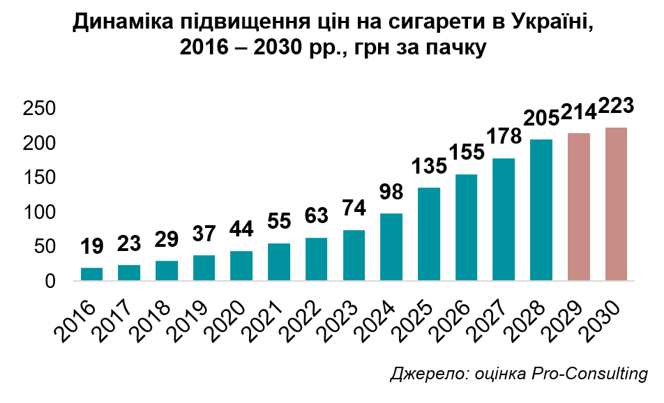З 2016 по 2025 рік ціна пачки сигарет зросла з 19 до 135 грн, а до 2030 року прогнозується зростання до 223 грн. За умови незмінності доходів підвищення цін чинить тиск на споживачів з низькою купівельною спроможністю. Це призводить до тінізації ринку та зростання нелегальної торгівлі.